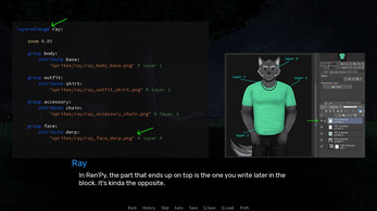 Coding with Ray guides you to learn Ren'Py in a fun way! With included dummy assets, you can have a step-by-step practice, see results fast, and understand the key concepts better. This project will cover essential subjects in VN development beyond the Ren'Py tutorial. See the full modules covered below.